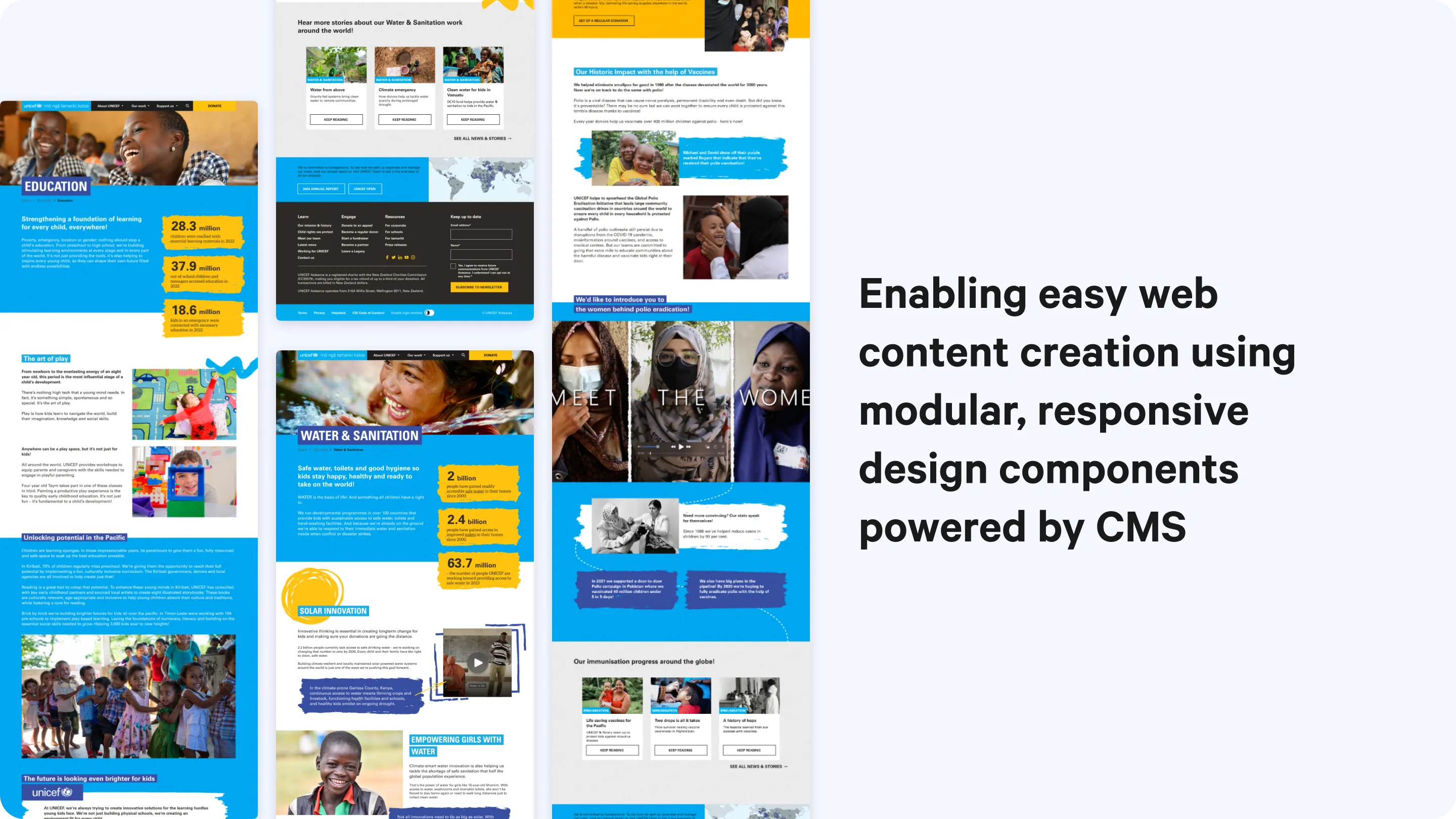 This approach directly addressed one of our key strategic goals from the workshop phase: creating a sustainable solution that wouldn't require ongoing design or development support. By teaching UNICEF's team to think in terms of flexible components rather than fixed templates, we equipped them to rapidly create new pages that maintained visual consistency.